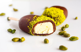 - Smelt noget chokolade over et vandbad og dyp isen i chokoladen og drys lidt hakket pistacienødder udover. Sæt dem tilbage i fryseren igen på et stykke bagepapir til de er størknet.